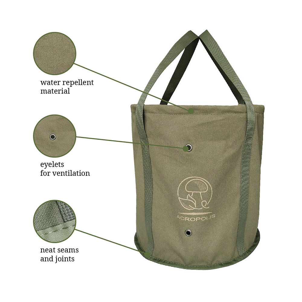 liBucket for picking mushrooms, made of durable water-repellent tarpaun. Does not cling to the branches of shrubs (raspberries, blackberries, etc.). It is well-ventilated thanks to metal eyelets which are mounted on the perimeter and bottom of a product. The mushrooms are not steamed.