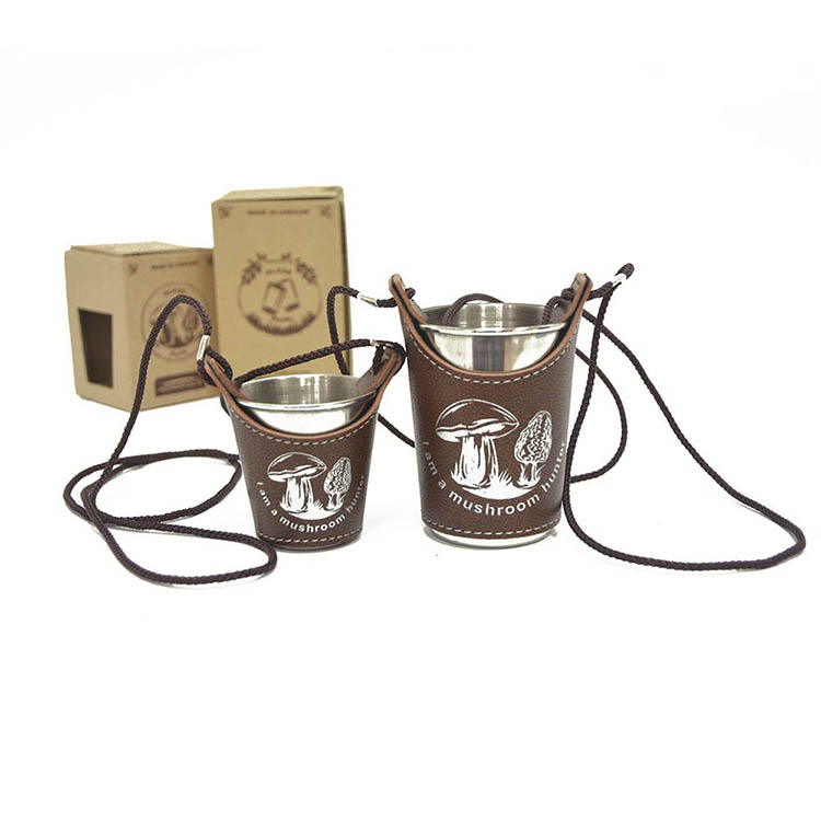 A set of 2 souvenir glasses in cases, decorated with prints “I am a mushroom hunter”. Stainless steel metal cups. Can be used both – in covers and separately.